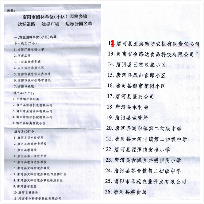 近日,南陽市公布了2018年度全市園林式居住區(qū)(單位)評選結(jié)果,亞澳南陽農(nóng)機有限責任公司榜上有名,榮獲市級“園林式單位”榮譽稱號。