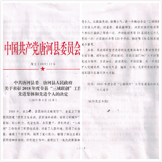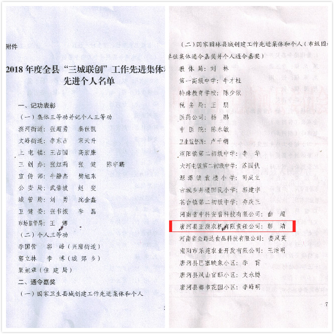 412日,唐河縣召開2018年度“三城聯(lián)創(chuàng)”總結(jié)大會(huì)。大會(huì)宣讀了表彰先進(jìn)集體及先進(jìn)個(gè)人的決定。亞澳農(nóng)機(jī)獲得2018年度國(guó)家園林縣城創(chuàng)建工作先進(jìn)集體。