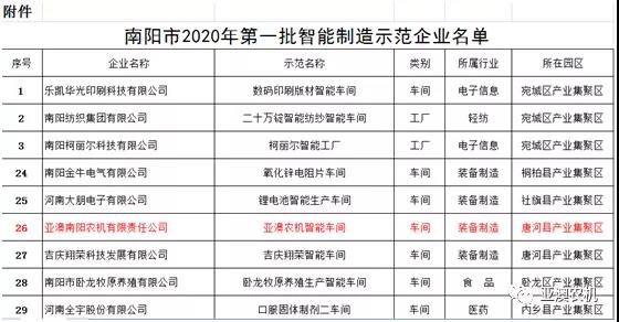 南陽市2020年第一批智能制造示范企業(yè)名單公布, 亞澳農(nóng)機入選