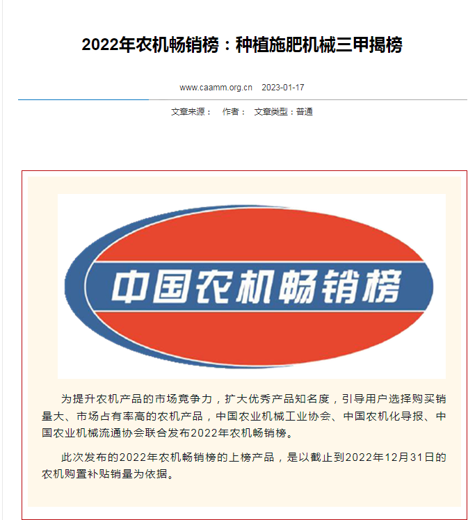 亞澳農(nóng)機(jī)榮獲2022年耕整地機(jī)械和 種植施肥機(jī)械農(nóng)機(jī)暢銷三甲榜