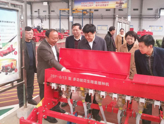 參觀過程中,劉樹華部長親切的向郭總咨詢公司的產(chǎn)品,郭總向劉樹華部長簡述了2BF-6/13 多功能花生精量播種機的功能構造,在得知該款機型當年投產(chǎn)當年熱銷后,劉部長十分高興的對郭總說:“亞澳要進一步開展科技研發(fā)工作,多培養(yǎng)、招聘科研人員,增強自身科研力量,成為農(nóng)機具行業(yè)的標桿”,周天龍縣長對劉樹華部長說:“縣政府已批給亞澳30多畝土地,作為亞澳的科技研發(fā)中心”。
